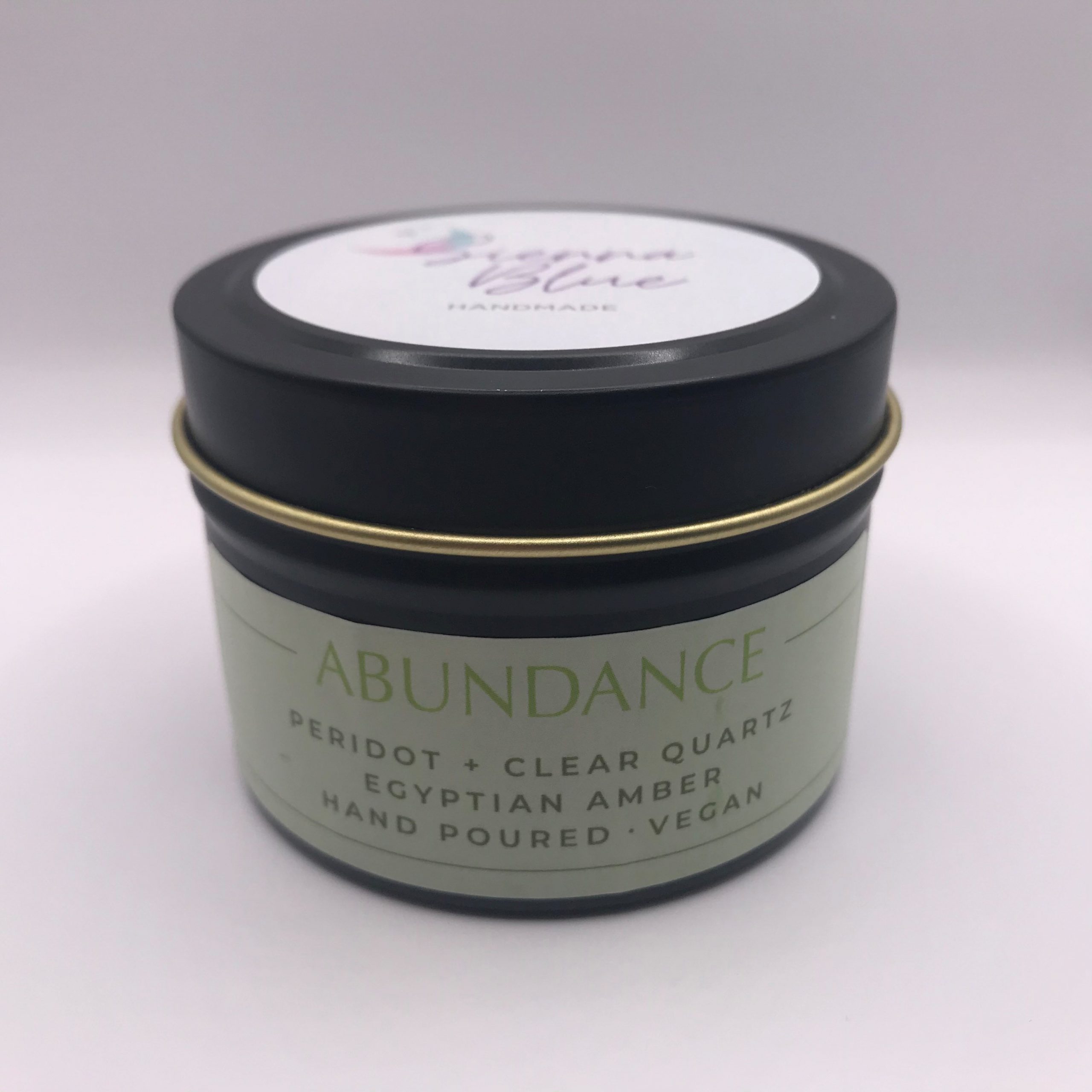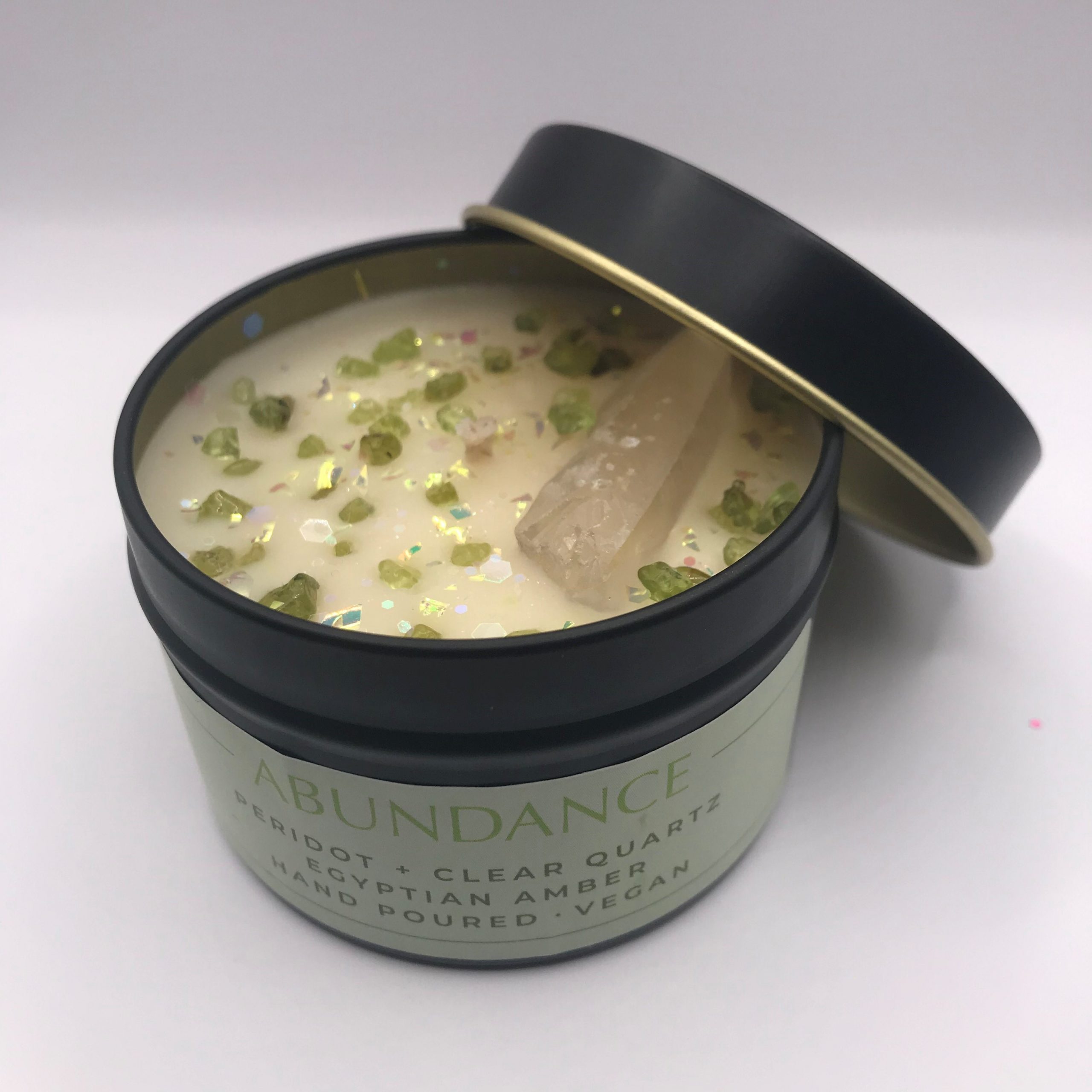 A creamy, delicious Egyptian Amber fragranced candle with Peridot and Clear Quartz.