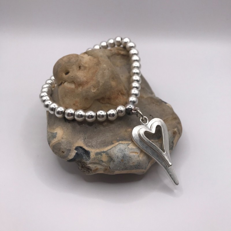 Silver beaded stretchy bracelet with matt silver heart charm,
