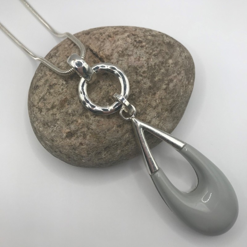 Large grey teardrop pendant on ring, 28” long necklace with extender chain,